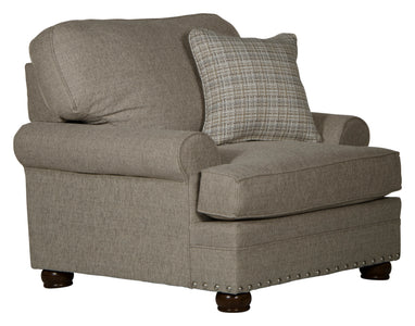 This living room group features a casual farmhouse style with its extra deep cushions, wooden legs, and loads of pillows! The companion ottoman features the added convenience of a large storage compartment.